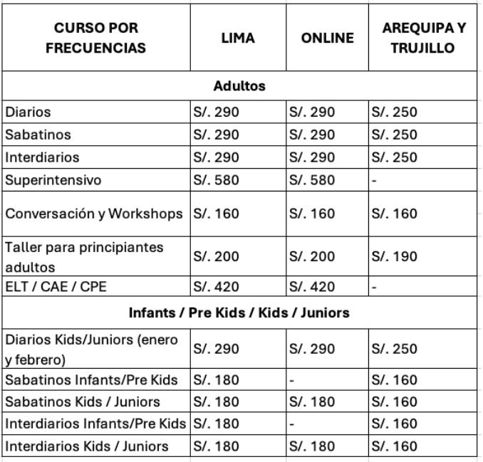 Les informamos que, a partir del 13 de octubre, entrarán en vigencia las nuevas tarifas de nuestros cursos detallados a continuación.